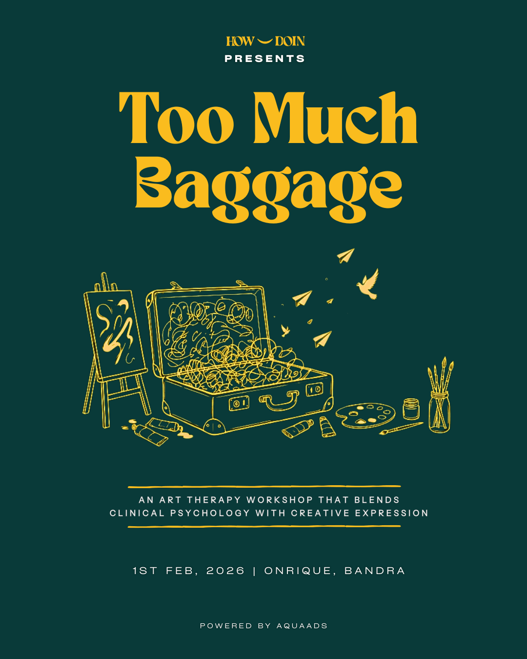 “Too Much Baggage” is an intimate, art-based group workshop designed for anyone who feels like they’ve been carrying a little too much lately. Guided by Psy. Shweta M., the session combines creative expression with a person-centered therapeutic approach, using simple, art-based exercises to help you slow down, notice what’s been weighing on you, and gently explore what it might feel like to let go. You don’t need to be good at art or have prior therapy experience, just bring yourself, your stories, and a willingness to pause.
